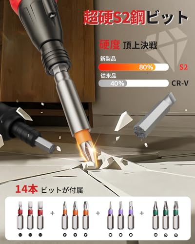 2025年モデル電動ドライバーは、14本の超硬S2鋼ビット、多様なネジに対応する正逆転切替スイッチ、高輝度LEDライトを搭載。