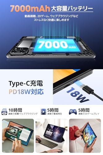 7000mAh大容量バッテリーは動画視聴約5時間、電子書籍約11時間の連続使用を可能にし、外出時の電池切れを軽減します。