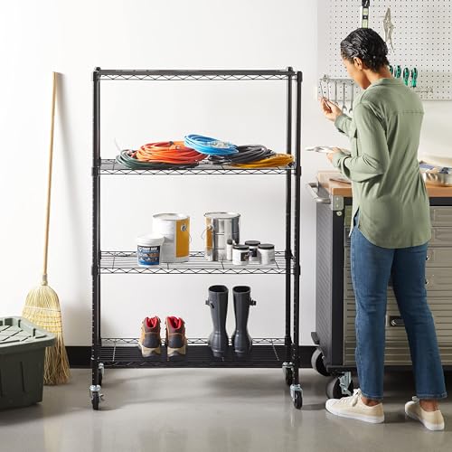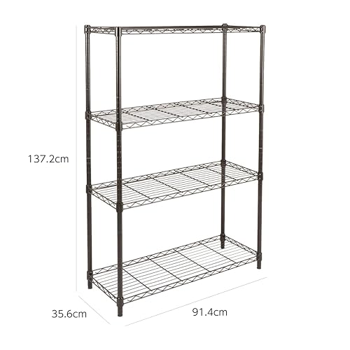 Amazonベーシックの4段スチールラックは、耐荷重635kgを誇る幅91.4cm、奥行35.6cm、高さ137.2cmのブラックメタルラックとして、多くのユーザーから実用的な収納解決策として支持されています。