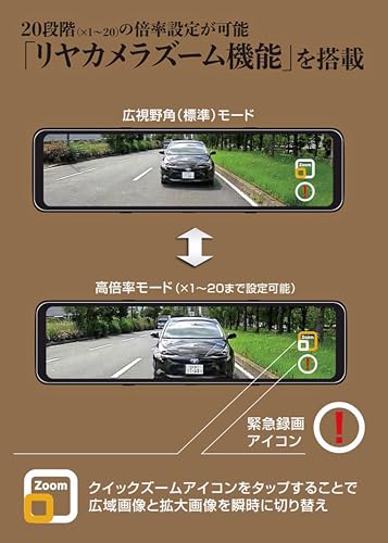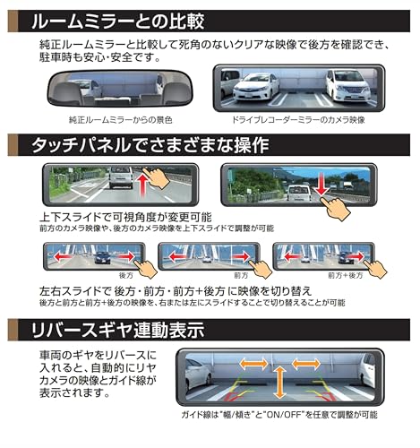 このミラー型ドライブレコーダーは、9.88インチの大画面ミラーに前後2カメラを内蔵しています。