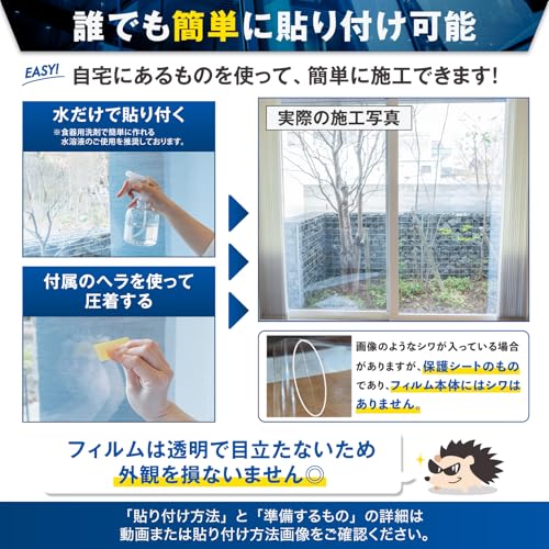 水と食器用洗剤で作る溶液で気泡を抑えながら施工ができる - 防犯ステッカーもセットに含まれ、抑止効果を高める設計