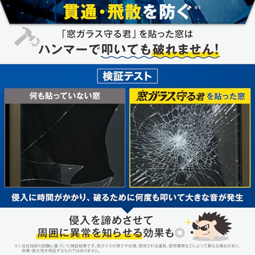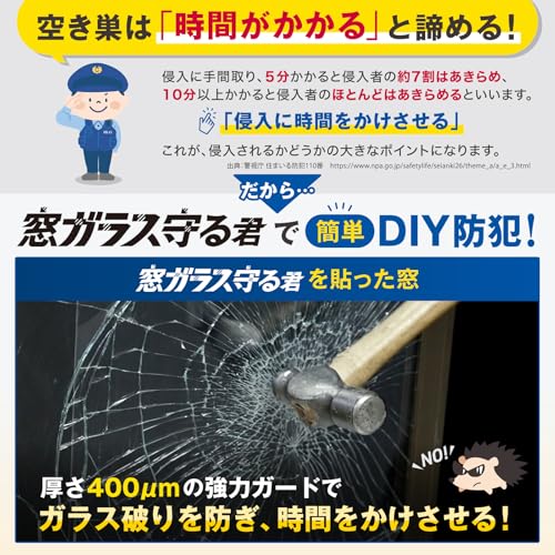 「窓ガラス守る君」の防犯フィルムは、厚み400μmの4層構造によりガラスの強化と飛散防止に有効ですが、防犯ステッカーと併用して抑止効果を高めるものの、犯罪の完全な予防を保証するものではありません。