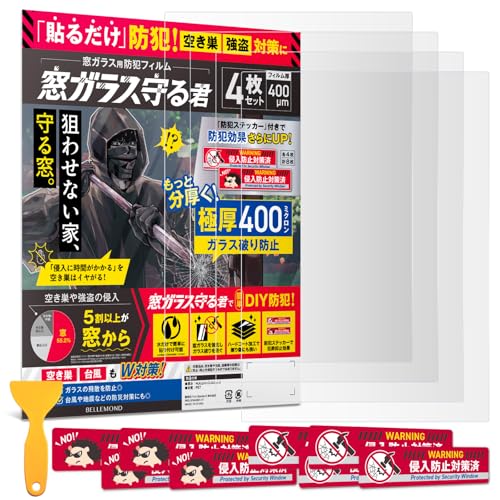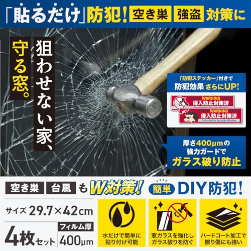 - セット内容:防犯フィルム4枚(29.7cm×42cm)、防犯ステッカー8枚(2デザイン、各4枚)、スクレーパー1個