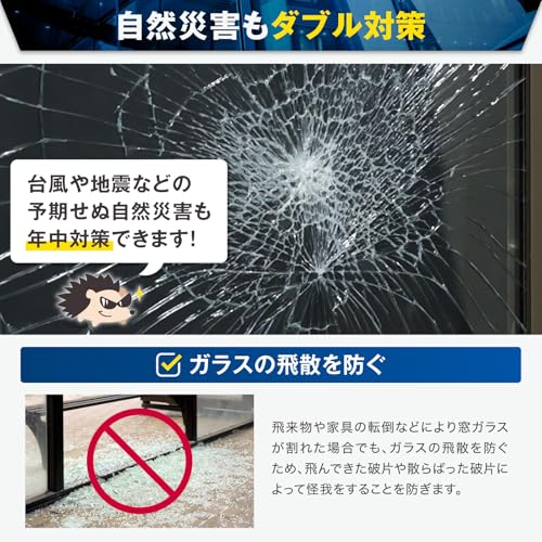 このような特性により、「窓ガラス守る君」は防犯だけでなく、自然災害時の窓ガラス飛散防止に役立ちます。
