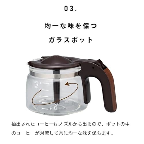 間欠抽出機能による丁寧な蒸らしや3段階の味調整、使いやすいガラスポット設計、自動保温機能など、細かな配慮が光ります。