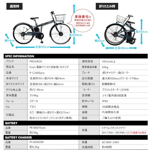 PROVROS Evanは、26インチの折りたたみタイプでありながら、最大105kmもの走行が可能な36V/7.8Ahのリチウムイオンバッテリーを搭載しています。