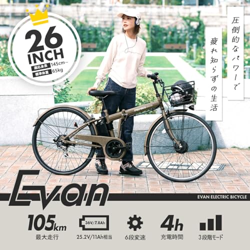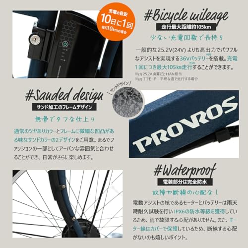 PROVROS Evanは、前輪駆動による軽快なアシスト感と高性能バッテリーによる長距離走行が特徴の電動アシスト自転車です。