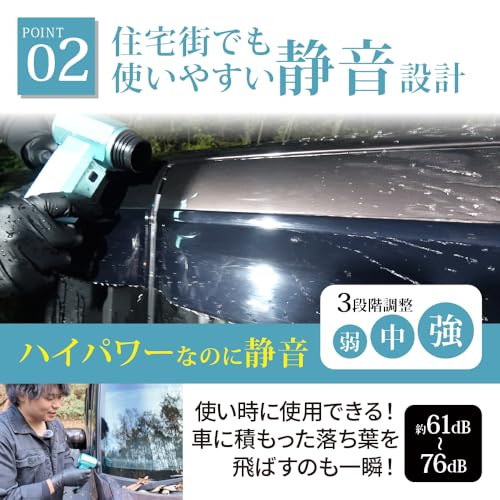 - 3段階の風量調整機能(弱・中・強)により、PCやキーボードの精密作業から洗車後のパワフルな水滴吹き飛ばしまで幅広く対応できます。