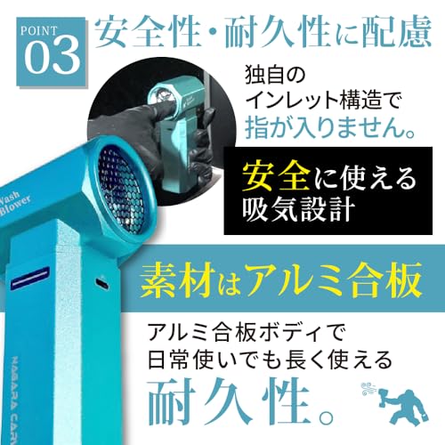 ながら洗車ウォッシュブロワーは吸気メッシュ設計で指やタオルの巻き込みを防ぎ、安全性が高いです。