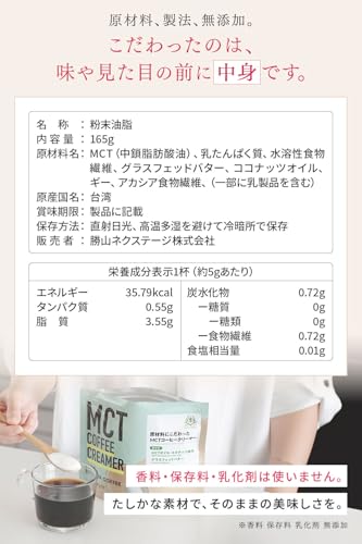 仙台勝山館のMCTコーヒークリーマーは、バターコーヒーを作るのに必要な「MCTオイル」と「グラスフェッドバター」が既に入っているパウダー状のコーヒークリーマーです。